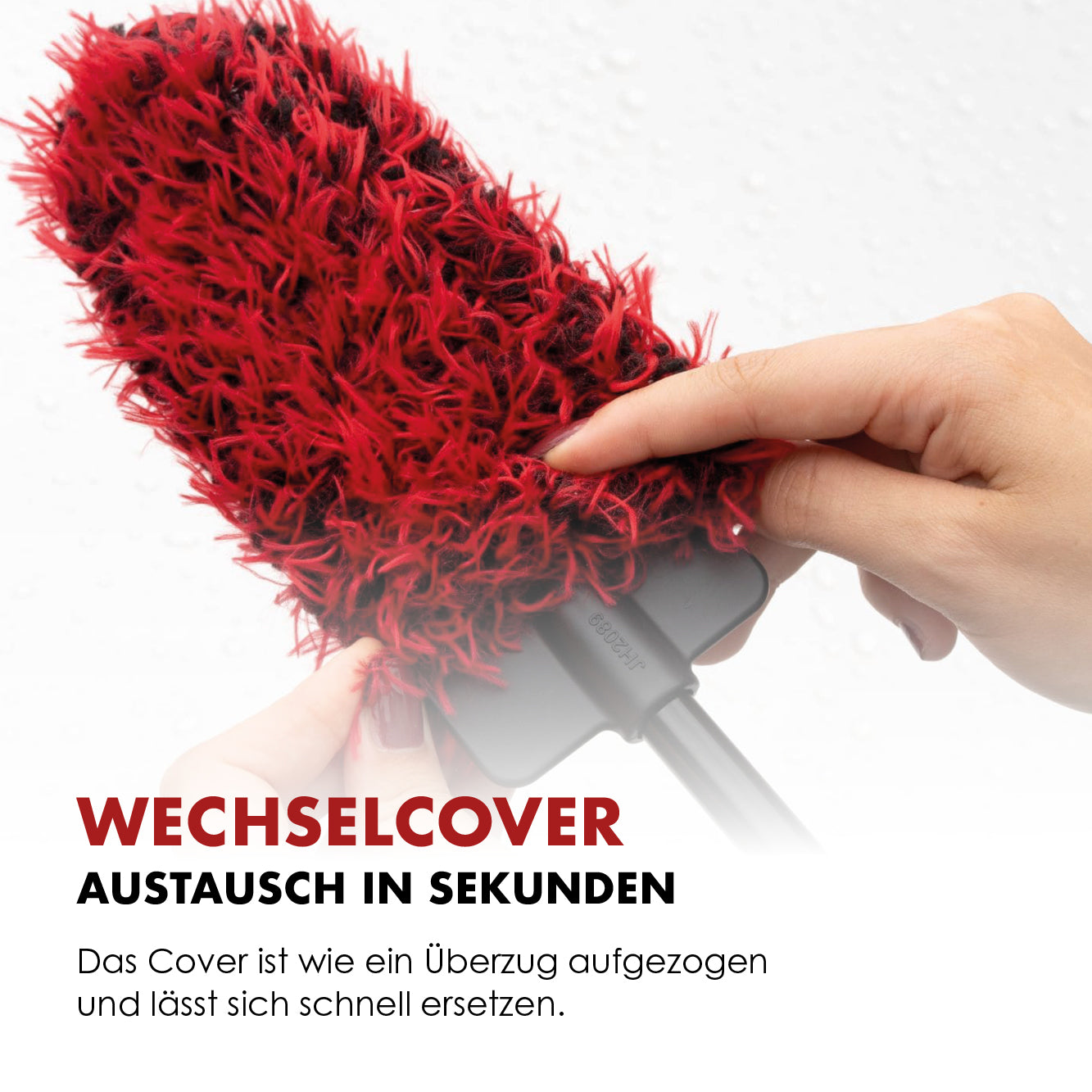 Takket være det praktiske design kan mikrofiberbetrækket nemt tages af og udskiftes. Så er din fælg-børste altid klar til brug og sikrer skinnende rene fælge.