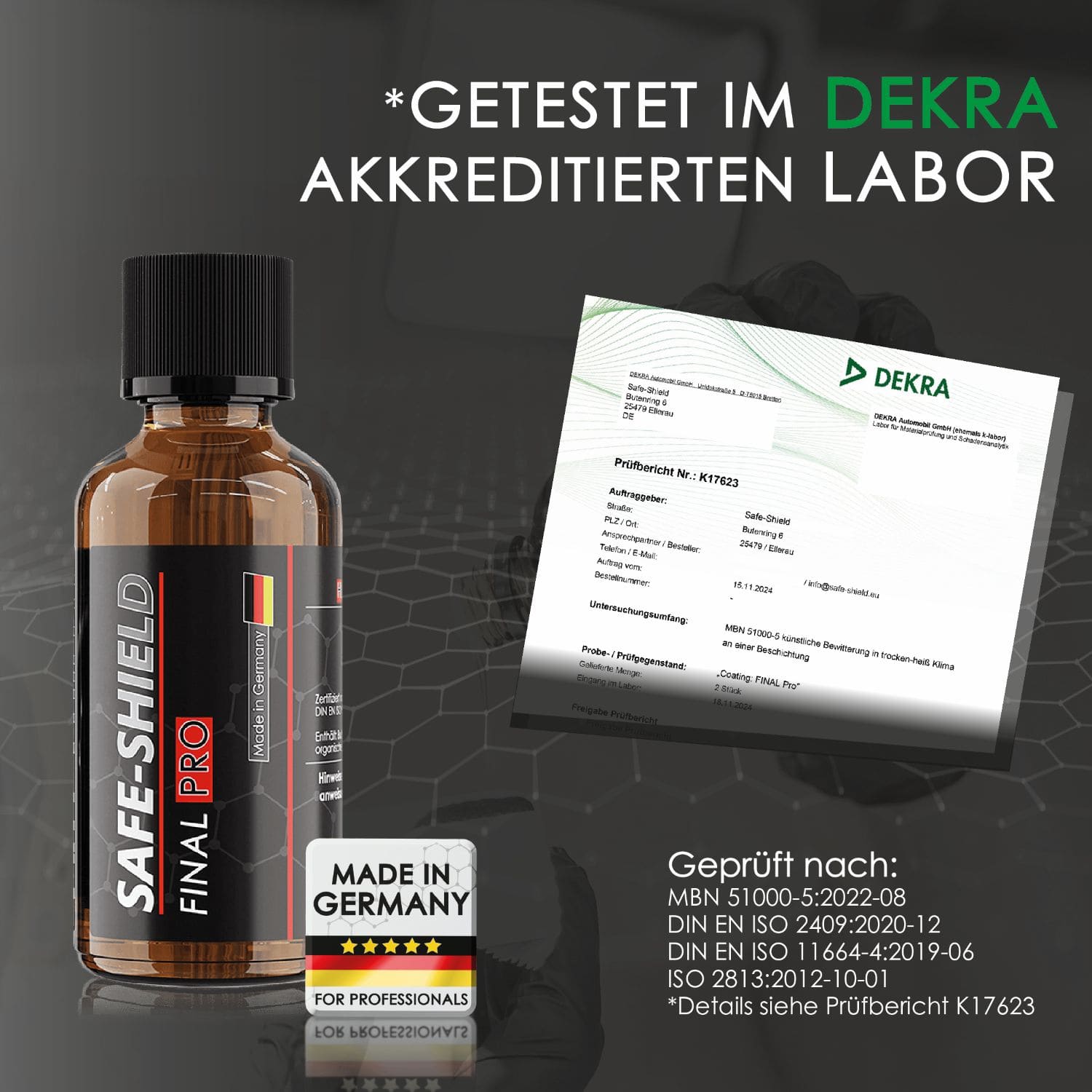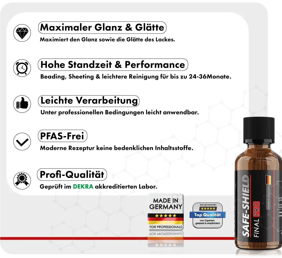 FINAL PRO garanterer dig ikke kun testede og sikre ingredienser, men også maksimal ydeevne – fra overfladeglathed til intens glans og en imponerende hydrofobi (vandafvisende egenskab).
