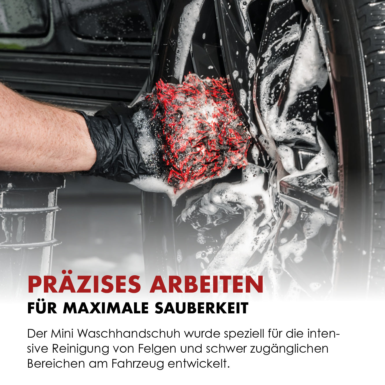 Mini fælgvaskehandsken er specielt udviklet til at rengøre fælge endnu mere målrettet og grundigt – selv dér, hvor almindelige børster eller store vaskehandsker ikke kan nå. Med den direkte kontakt til overfladen har du fuld kontrol over hver bevægelse og når nemt smalle eger, fordybninger og kanter.