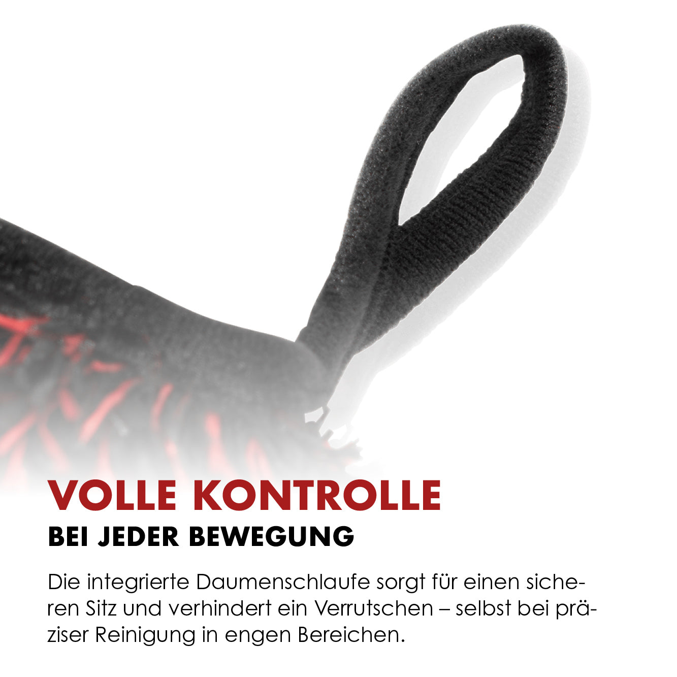 Den højkvalitets, langhårede mikrofiber rengør effektivt og samtidig særligt skånsomt – ideel til følsomme fælgeoverflader. Den integrerede tommelfingerstrop sikrer et godt greb, selv med våde hænder eller ved fint arbejde.